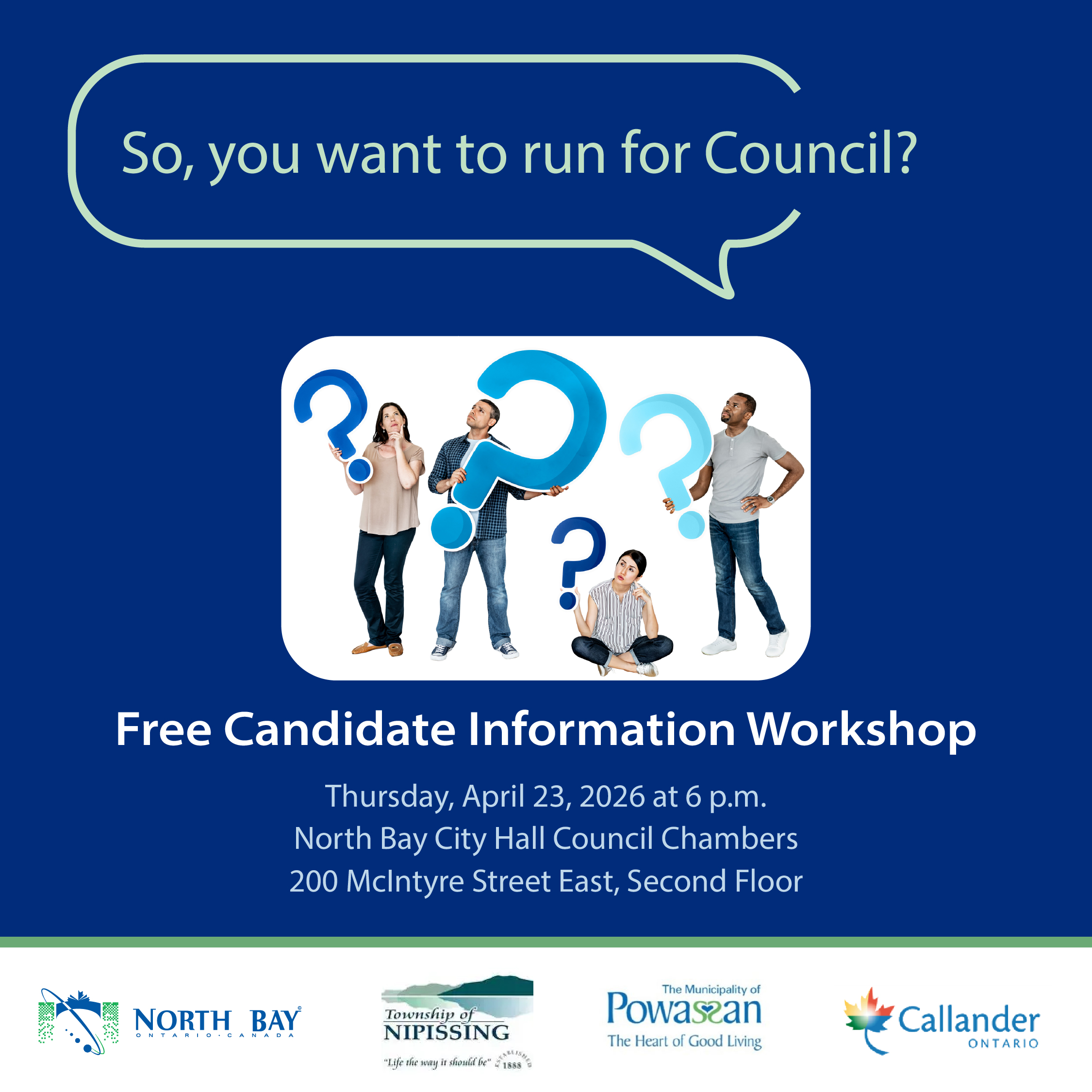Bring your questions on Thursday, April 23, 2026, at 6 p.m. at North Bay's City Hall, in the Council Chambers on the second floor. This event is being hosted by the City of North Bay, the Township of Nipissing, the Municipality of Powassan, and the Municipality of Callander.