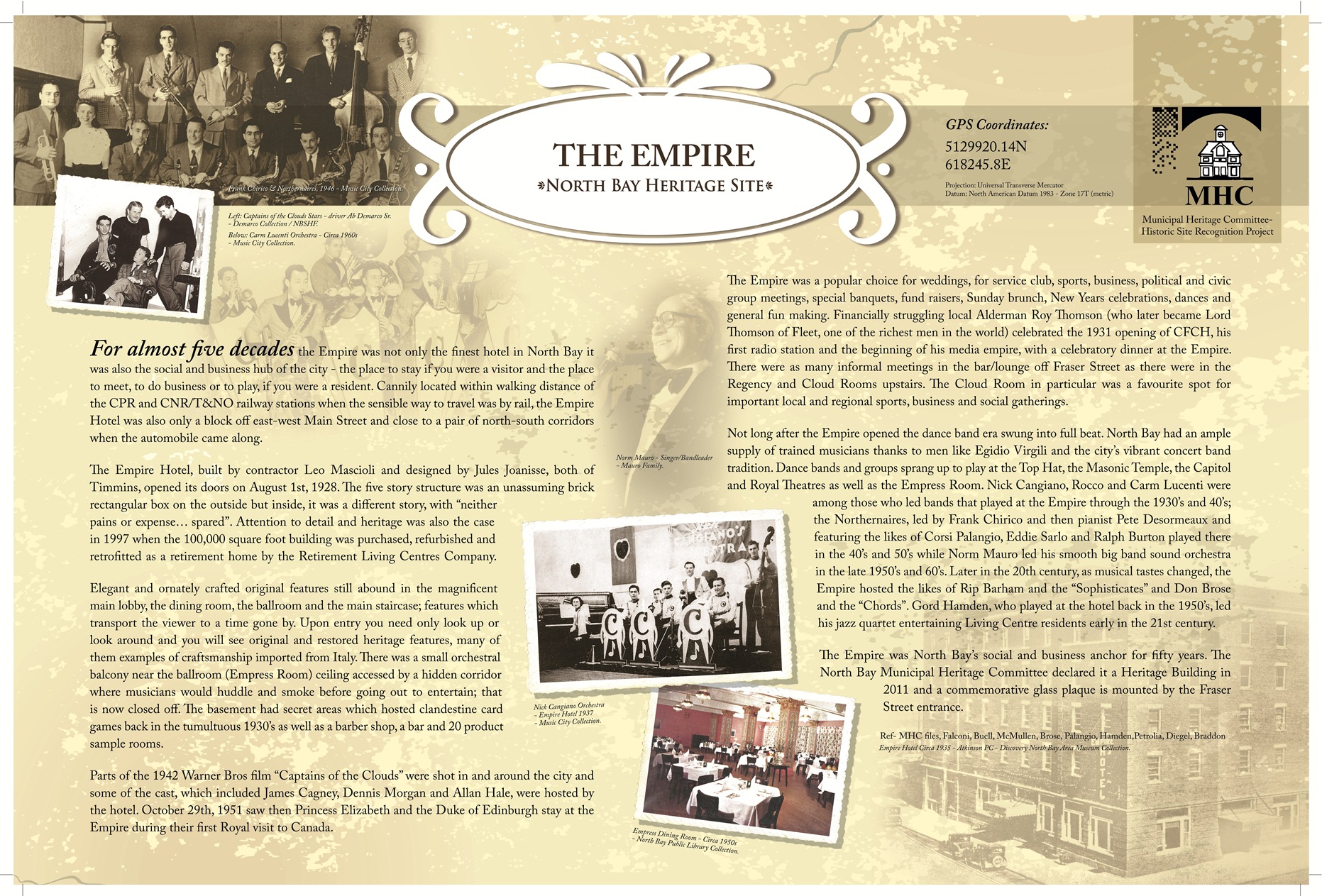 The Empire was North Bay’s social and business anchor for fifty years. The North Bay Municipal Heritage Committee declared it a Heritage Building in 2011 and a commemorative plaque is mounted by the Fraser Street entrance.
