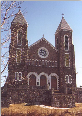 Derived from the Romanesque style, the heavy massing of this church is achieved through the use of local cut stone, round headed arches over most openings, and the twin towers.