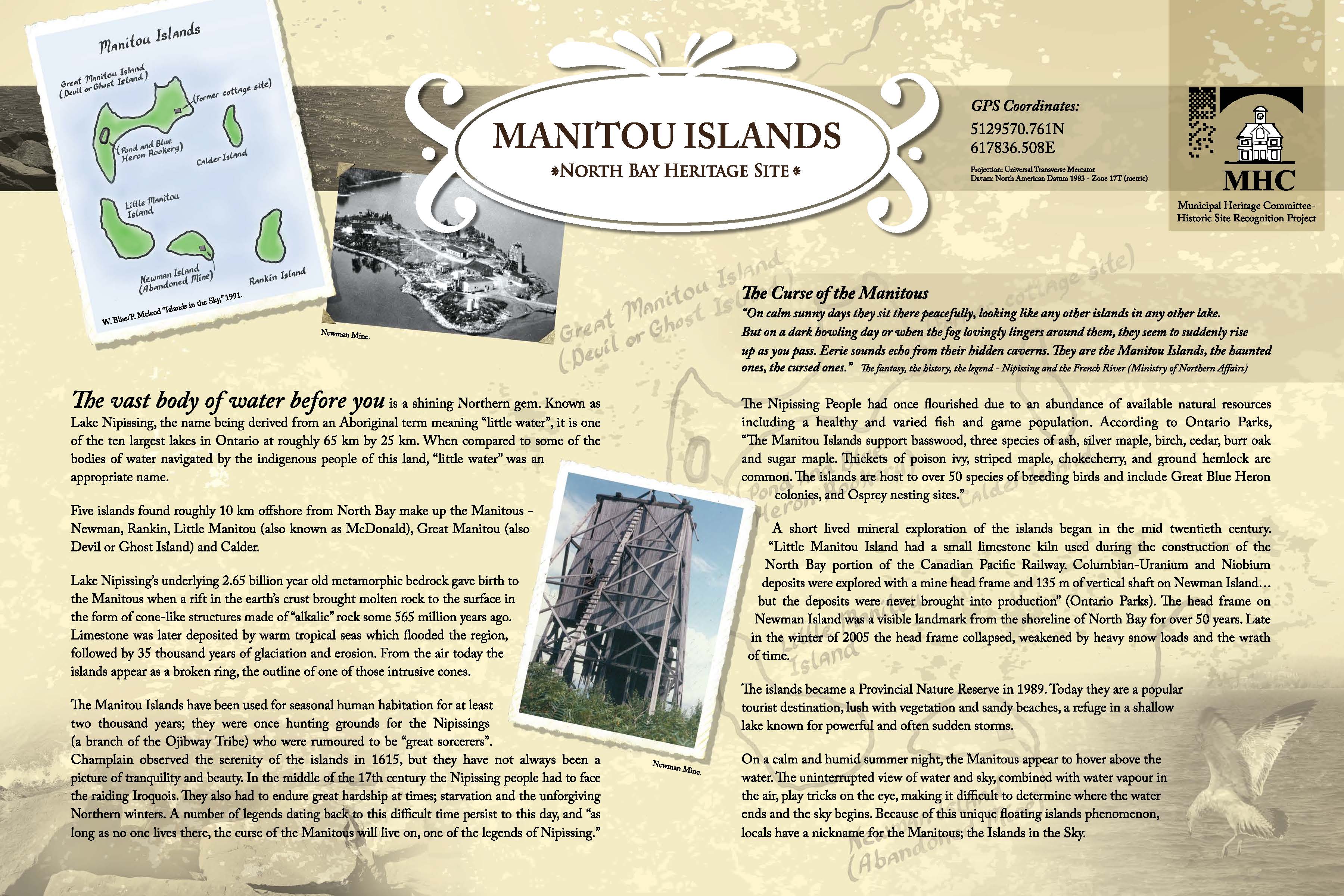 Five islands located roughly 10km offshore from North Bay on Lake Nipissing make up the Manitous. These five islands are Newman, Rankin, Little Manitou (also known as McDonald), Great Manitou (also Devil or Ghost Island) and Calder. From the air today the islands appear as a broken ring; the outline of an ancient rock structure.