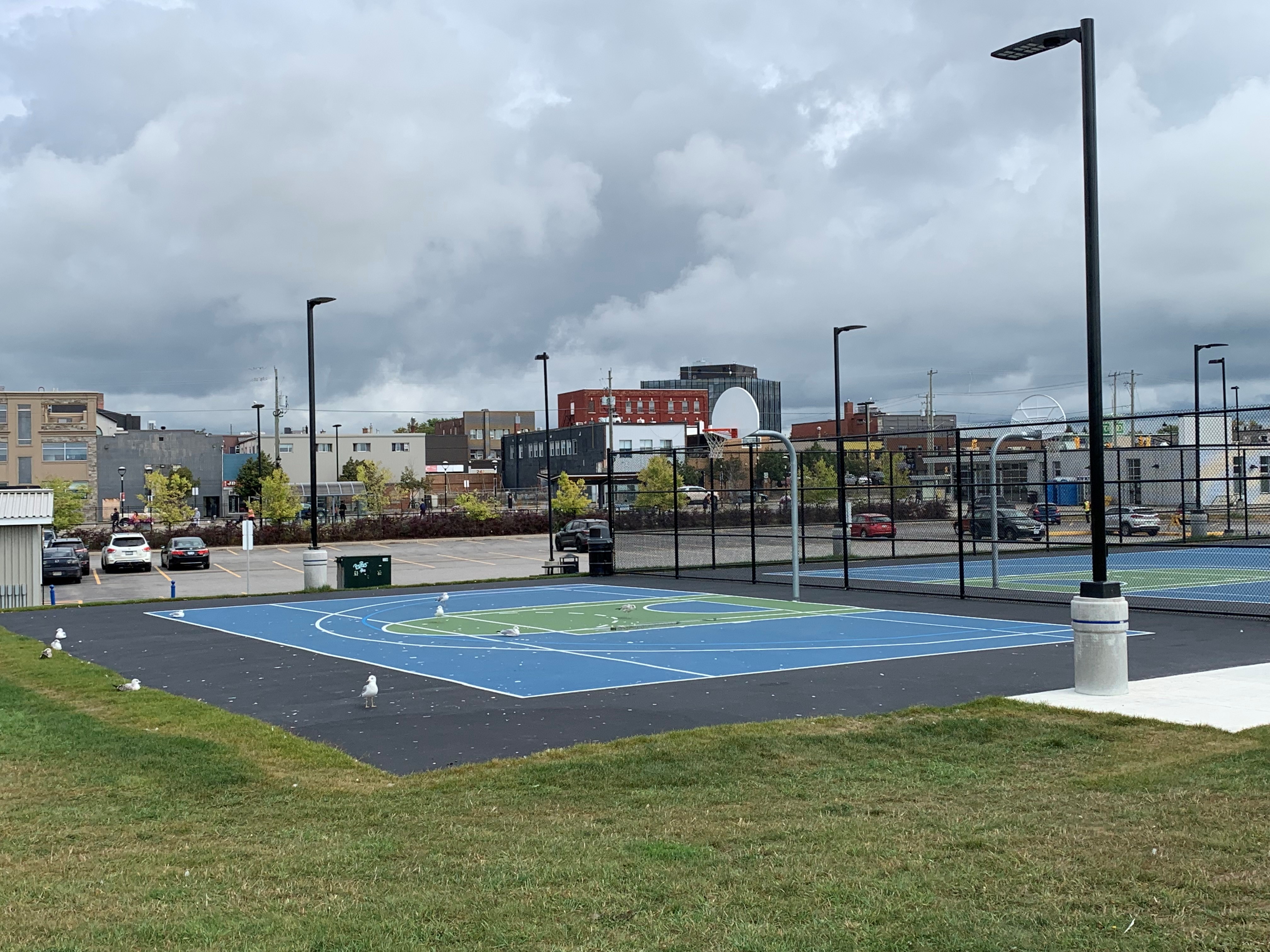 The Multi-Use Recreational Courts located behind the North Bay Transit Terminal opened in April of 2022 and features one full-size court and one half-size court. Painted lines currently accommodate basketball but could accommodate other sports in the future depending on the needs.