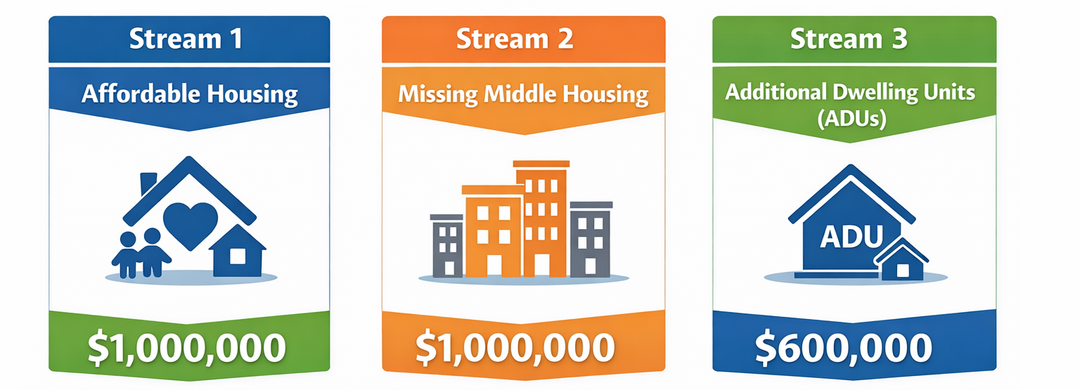 In Year 2 of the Housing Accelerator Fund (HAF), Council has approved three streams of funding, available starting January 2026. Applicants must choose one stream to apply under, and submissions will be evaluated and ranked based on eligibility criteria and available funding for that stream.
