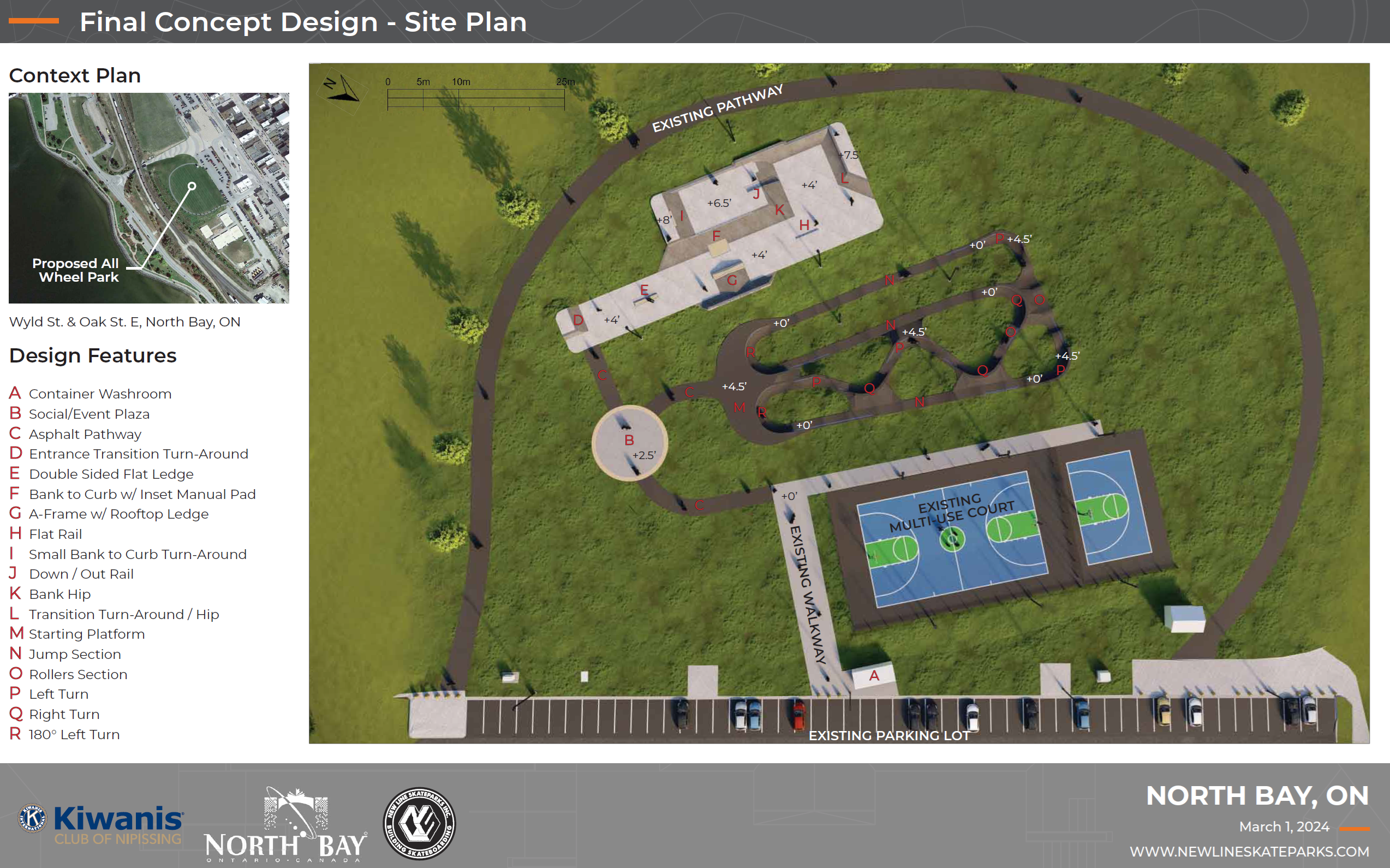 Scheduled for completion in late fall, the Kiwanis All-Wheel Park project is being supported by an $801,198 contribution from the Northern Ontario Heritage Fund Corporation (NOHFC) and $100,000 from the Kiwanis Club of Nipissing.