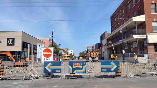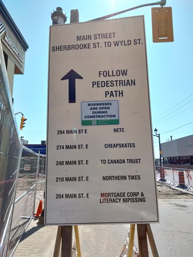 All businesses’ access will remain open during the construction with temporary wayfinding signage placed at both the ends of the construction limits on each road section as necessary. The DIA (Downtown North Bay & Waterfront) has also installed DIA branded signage along the construction fencing in several areas.